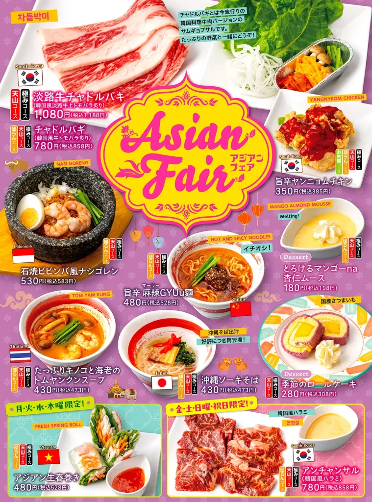 秋の期間限定メニュー「アジアンフェア」がはじまります。焼肉食べ放題でアジア各国の風味をお楽しみください。